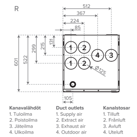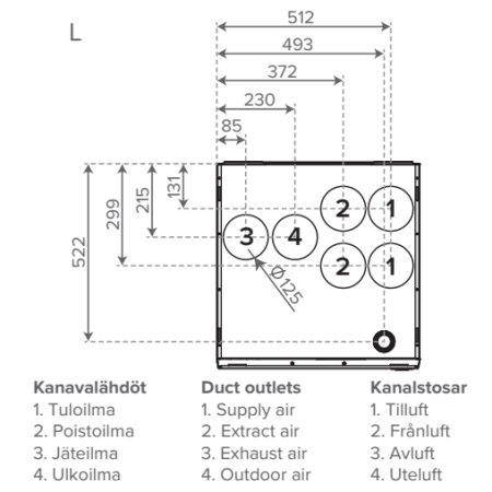 A-H mudelid erinevad ainult kanalite väljundite poolest ning kanalite väljundid asuvad samades kohtades, mis vanadel ventilatsiooniseadmete mudelitel või vajavad vaid väiksemaid kanalite muudatusi. Vallox 125 MV seadmega saab lihtsalt ja kiirelt kaasaegsete funktsioonidega energiasäästliku ventilatsiooni.