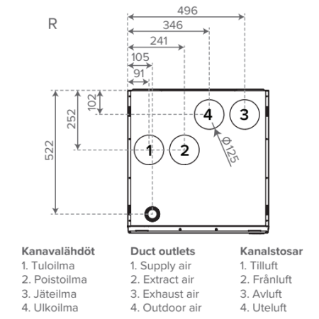 A-H mudelid erinevad ainult kanalite väljundite poolest ning kanalite väljundid asuvad samades kohtades, mis vanadel ventilatsiooniseadmete mudelitel või vajavad vaid väiksemaid kanalite muudatusi. Vallox 125 MV seadmega saab lihtsalt ja kiirelt kaasaegsete funktsioonidega energiasäästliku ventilatsiooni.